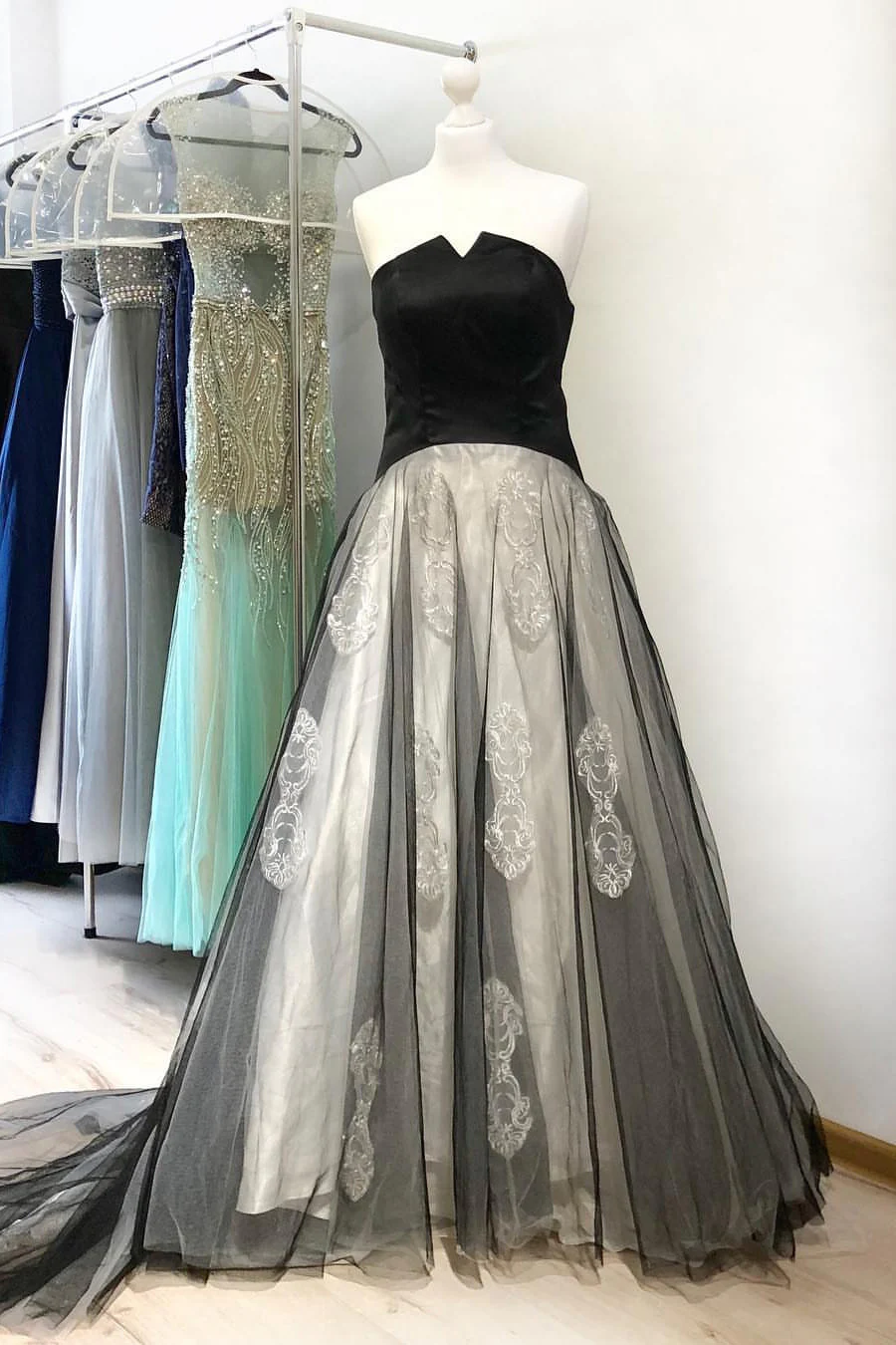 A Line Black Strapless Appliques Long Cheap Prom Dress OKI48