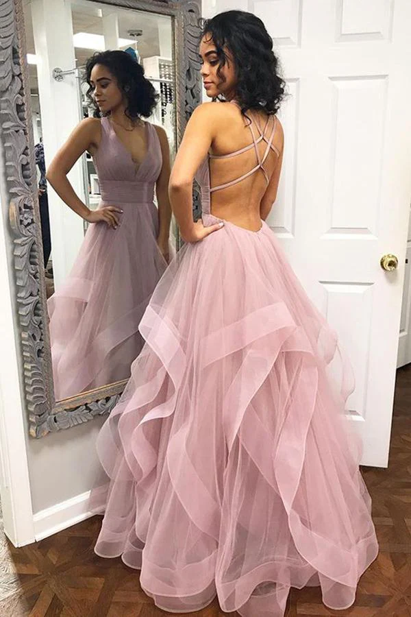 Charming A-Line V-Neck Floor-Length Pink Tulle Prom Dresses with Appliques Beading PW533