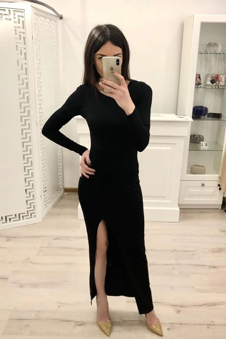 Sheath Long Sleeves Split Black Sexy Prom Dress, Formal Evening Dresses OKI80