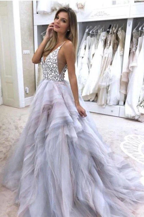 Charming A Line Tulle Lace V Neck Floor Length Prom Dress OKI46