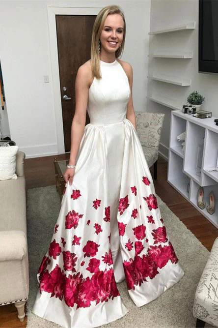 A-Line Halter Backless Long Prom Dresses with Pockets OKL64