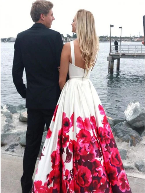 A-Line Spaghetti Straps Floral Print Long Prom Dresses OKL94
