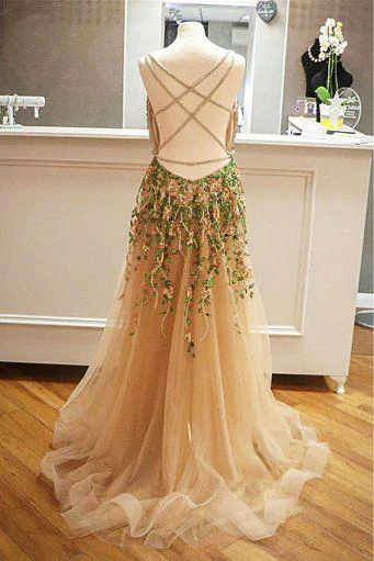 A-Line V-Neck Tulle Prom Dresses with Floral Appliques OKL70