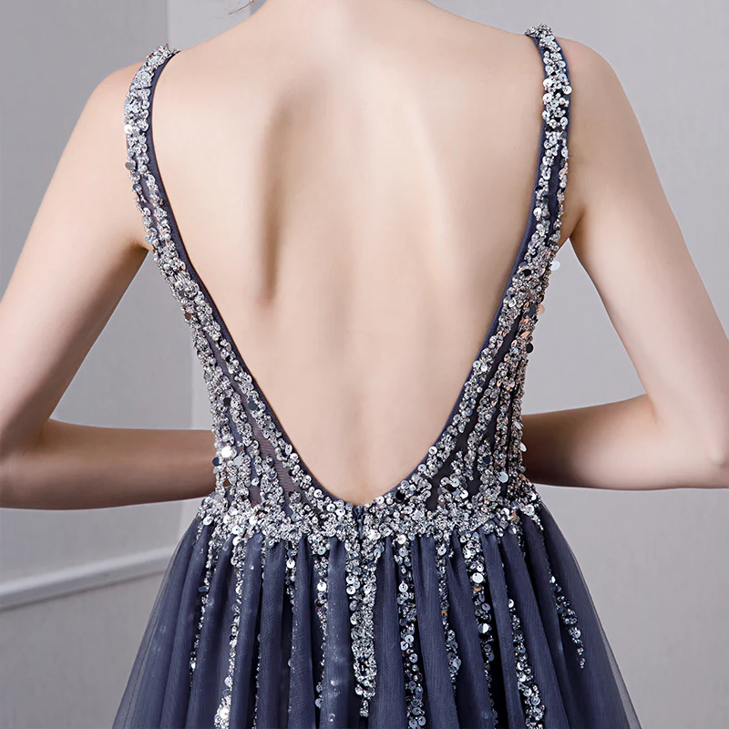 A-Line V Neck Backless Navy Blue Lace Prom Dresses with Sequins OKL63