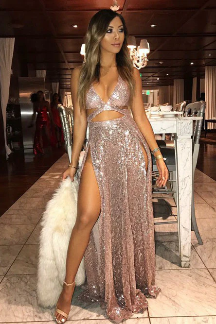 Sexy A-Line Spaghetti Straps Backless Sequined Prom Dresses with Split OKL71