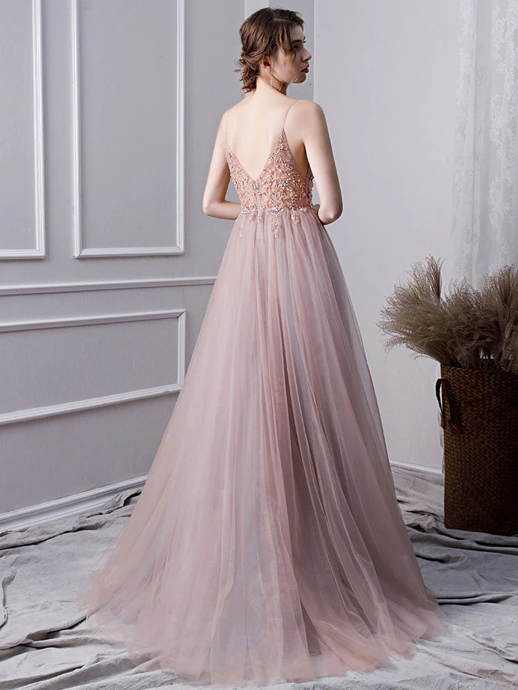 Pink A Line Spaghetti Straps Tulle Beaded Prom Dress With Appliques OKL25