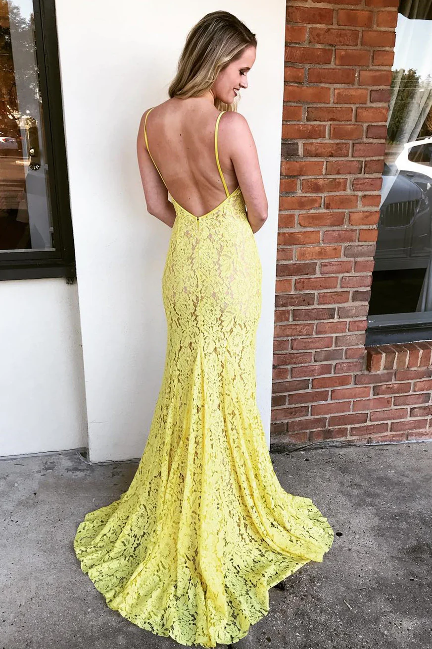 Spaghetti Straps Mermaid Yellow Lace Long Prom Dresses with Slit OKL93