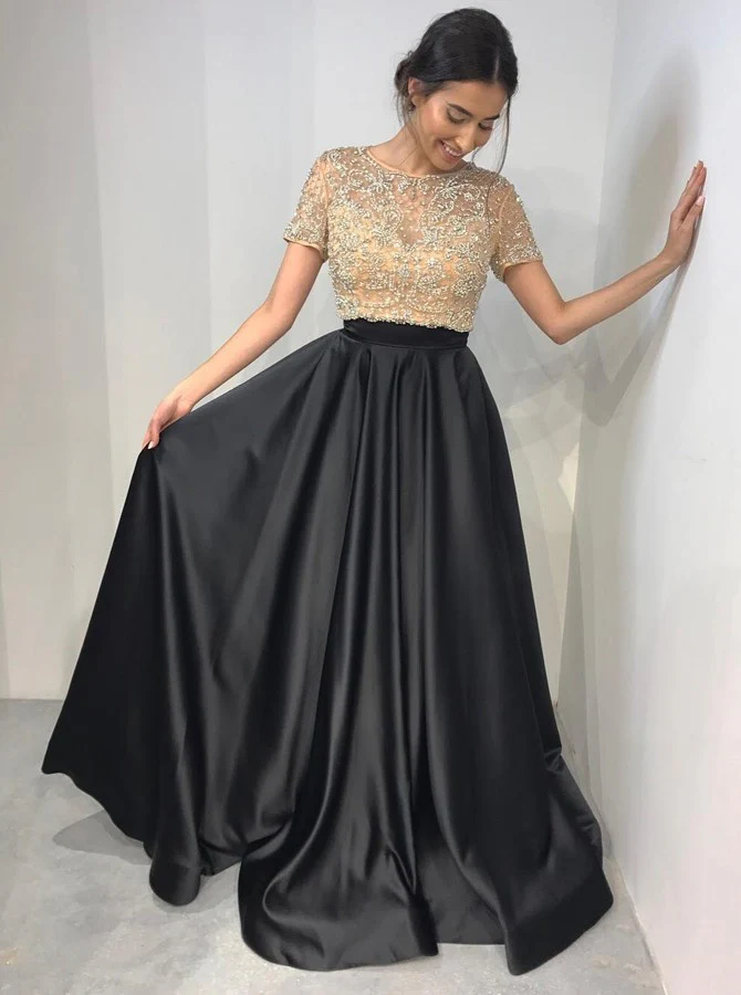 Two Piece Crew Short Sleeves Floor-Length Black Prom Dresses with Beading OKL89