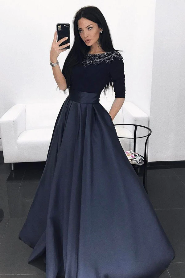 A-Line Bateau Half Sleeves Dark Blue Prom Dresses with Beading Pockets OKL82