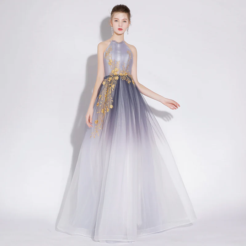 A Line Halter Tulle Long Prom Dress With Appliques OKL28