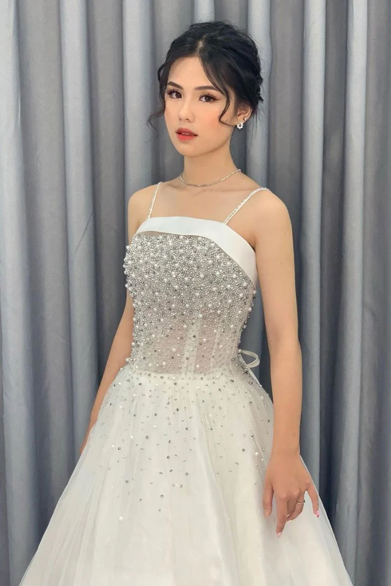 Off White A Line Spaghetti Straps Beading Elegant Long Prom Dresses OKP74