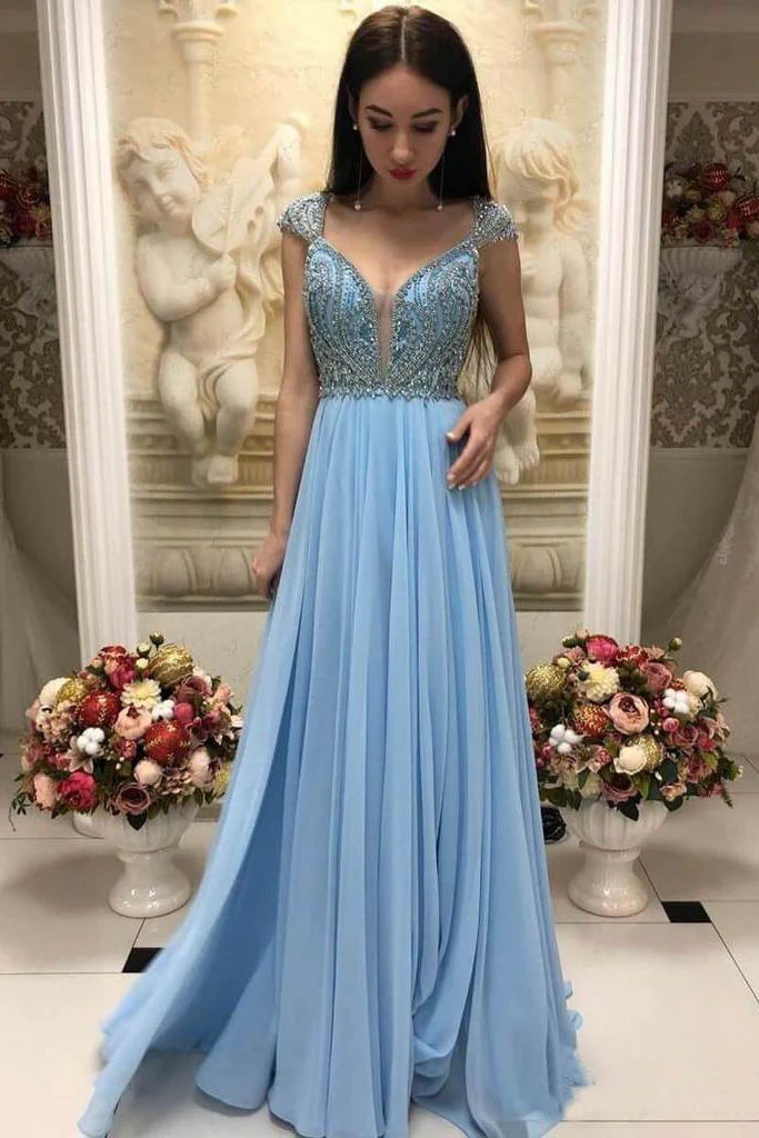 Elegant A-Line Beaded Sky Blue Prom Dress With Cap Sleeves OKO96