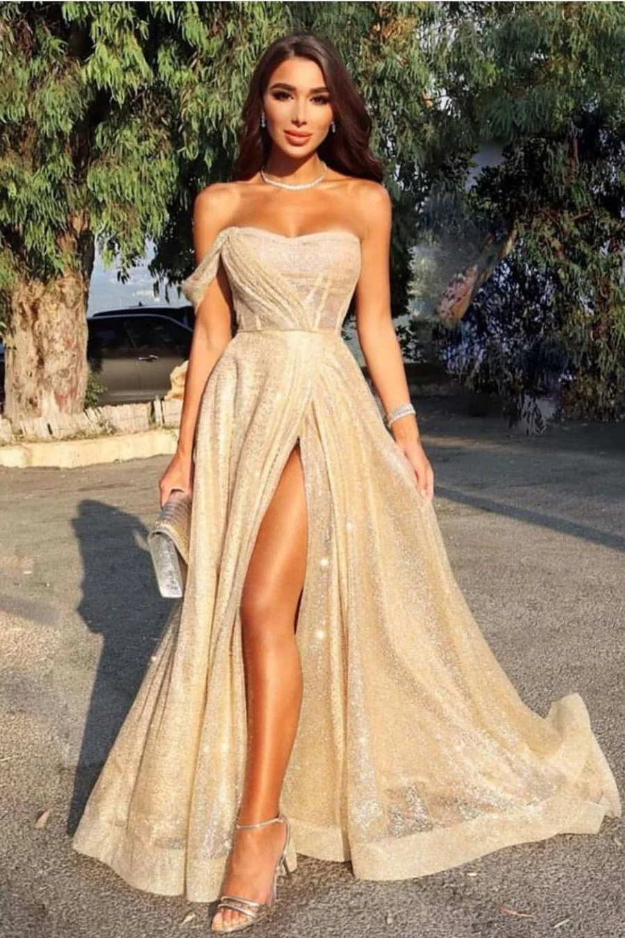 New Golden Off Shoulder Long Sleeves Chiffon A Line Party Prom Dresses For Women OK533