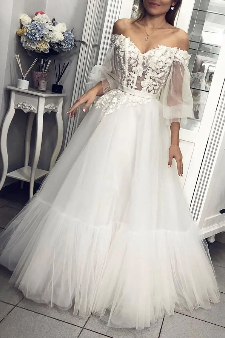 Off the Shoulder Long Sleeves Appliques Tulle A Line Prom Dress OKQ1
