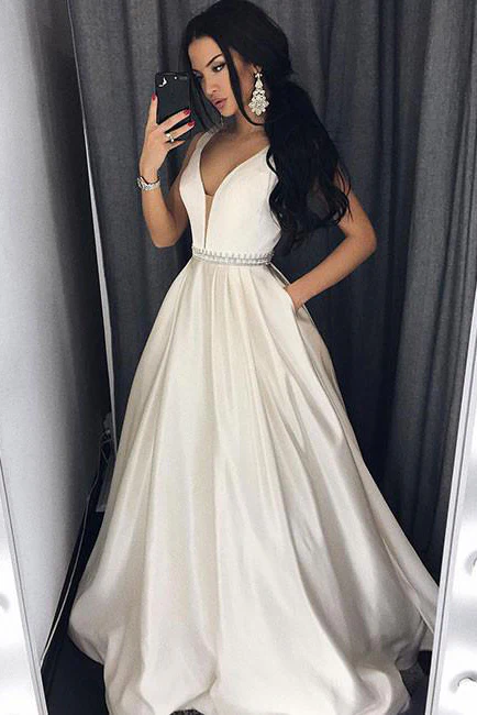 Sexy Deep V-Neck Ivory Long Prom Dresses with Pockets,Formal Evening Dress OK577