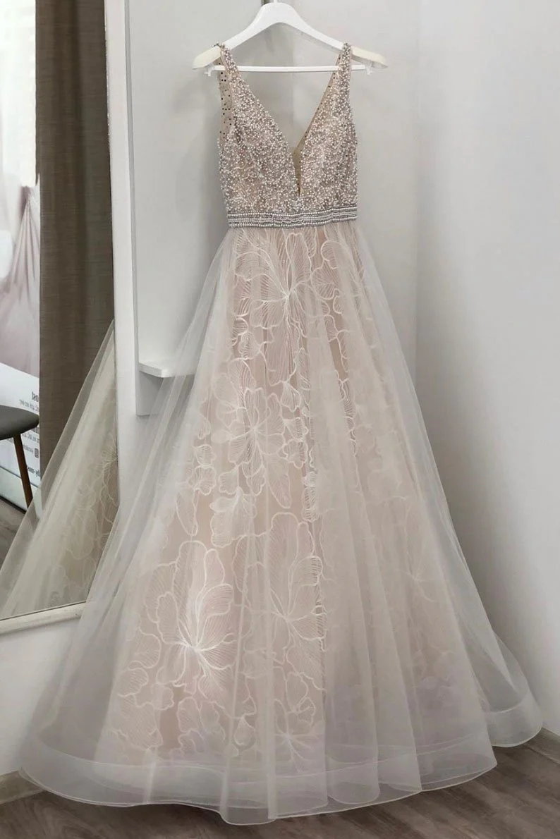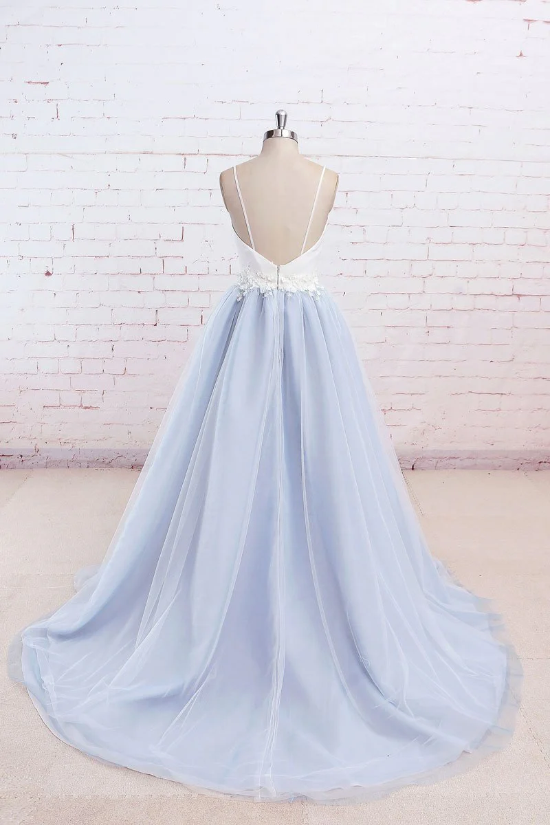 Spaghetti Straps V-neck Long Tulle Wedding Dress Prom Dresses with Appliques OK547