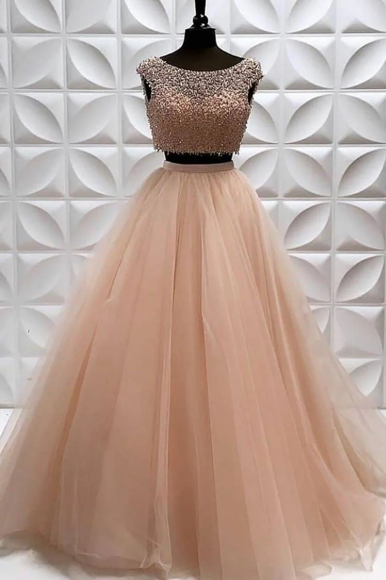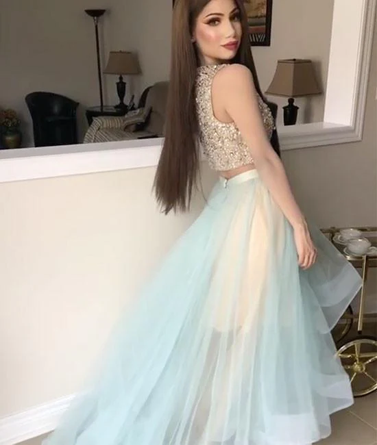 Two Pieces A Line Tulle Beading Long Sleeveless Prom Dresses OKP82