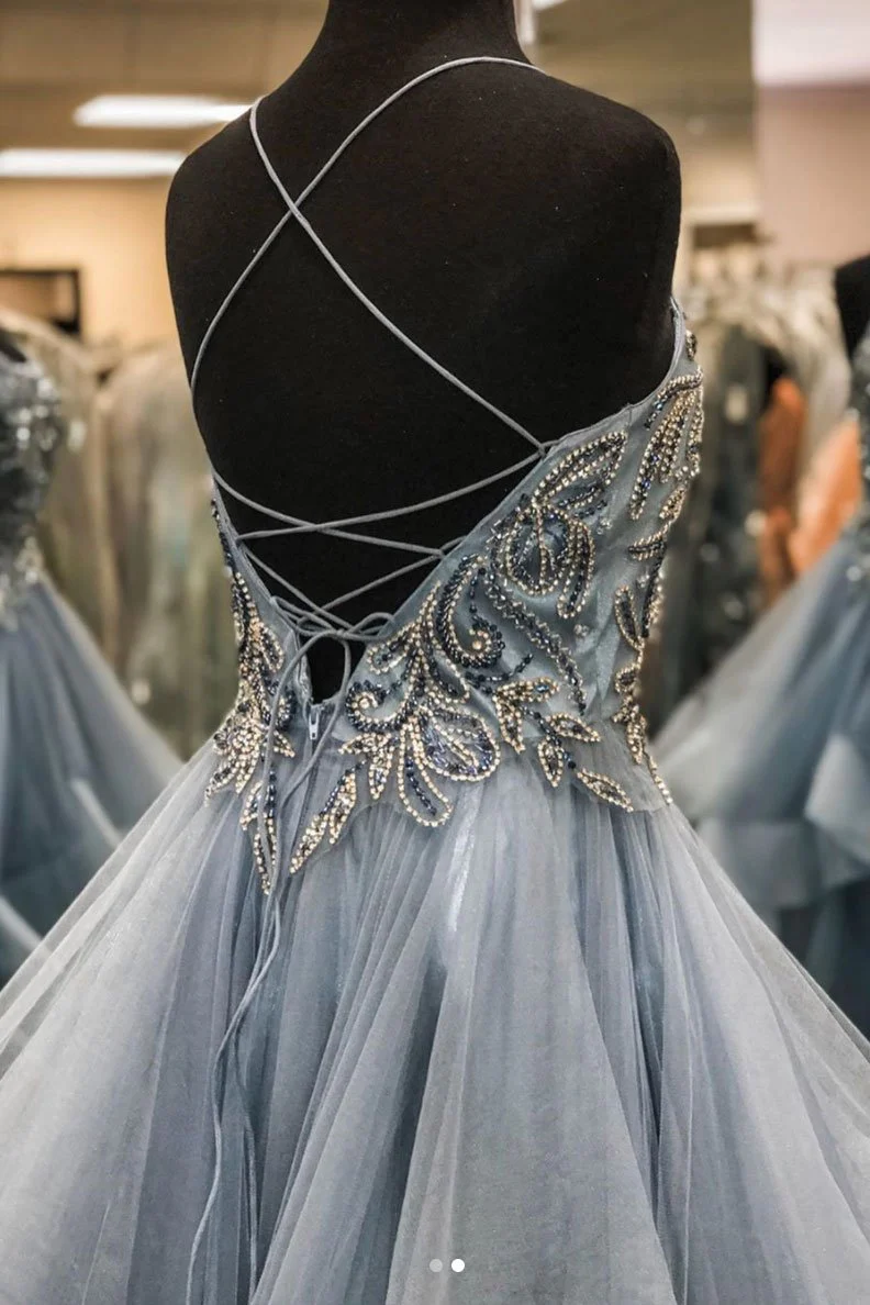 Gray Tulle Beads Long Prom Dresses A Line Formal Evening Dresses OKQ33