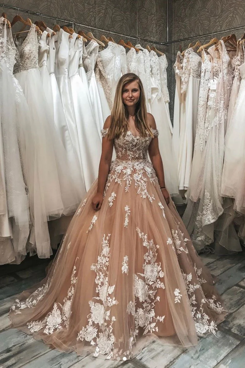 Ball Gown Off the Shoulder Lace Appliques Tulle Prom Dress OKP99