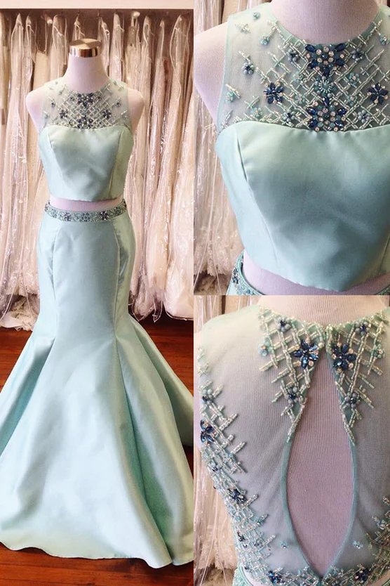 Two Pieces Long Mermaid Satin Prom Dress For Teens,Beading Mint Backless Prom Gowns OK502