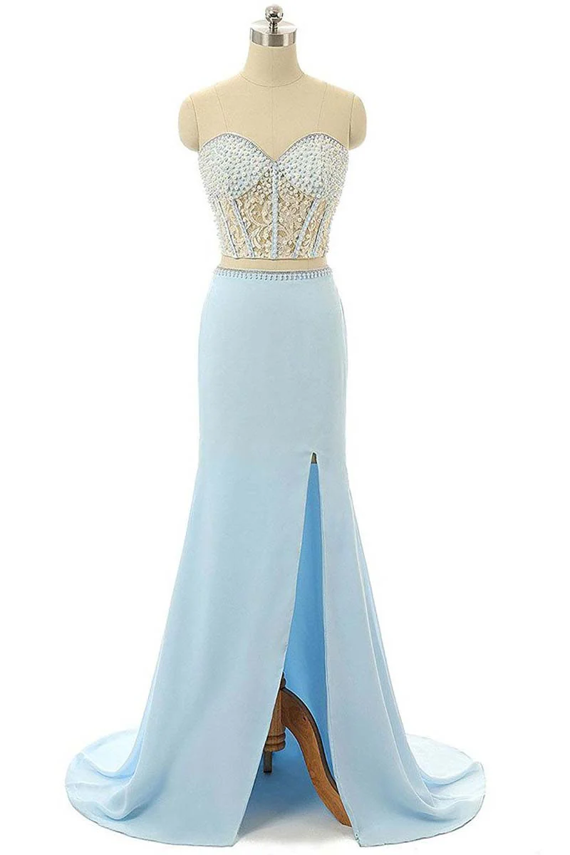Elegant Mermaid Sweetheart Chiffon Sweep Train Split Front Light Sky Blue Prom Dress OK621