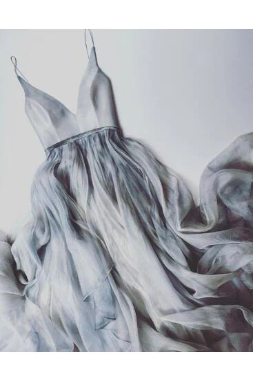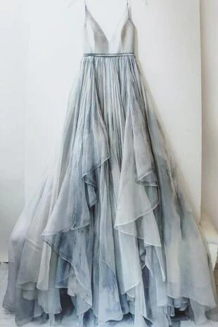 Charming A Line Spaghetti Straps V Neck Long Grey Tulle Prom Dress OK634