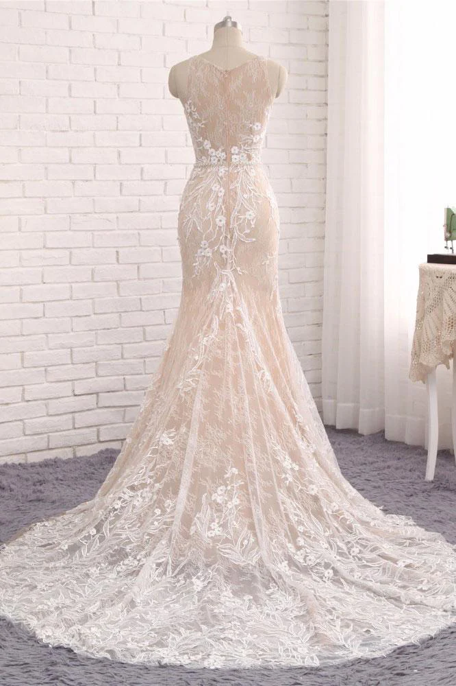 Unique Mermaid White Sleeveless Prom Dresses,Lace Long Sweep Train Wedding Dress OK636