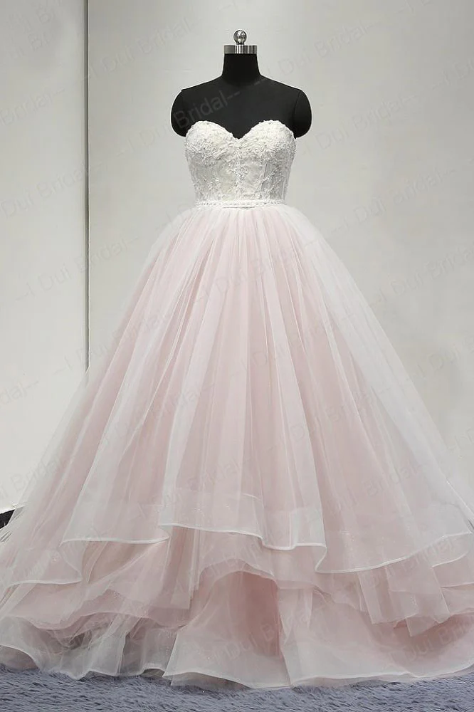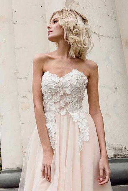 Beautiful A-Line Sweetheart Strapless Tulle Pearl Pink Long Prom Dresses with Appliques OK679