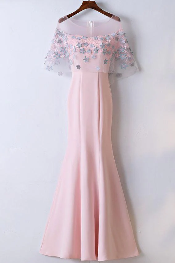 Elegant Pink Round Neck Short Sleeves Satin Lace Applique Long Prom Dress OK649