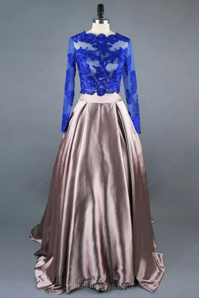 A Line Royal Blue Two Piece Long Sleeve Lace Top Prom Dress OK614