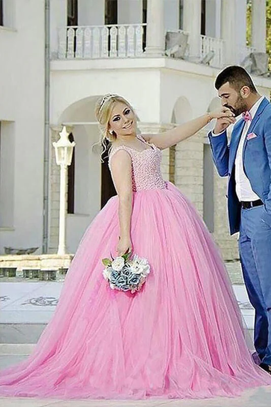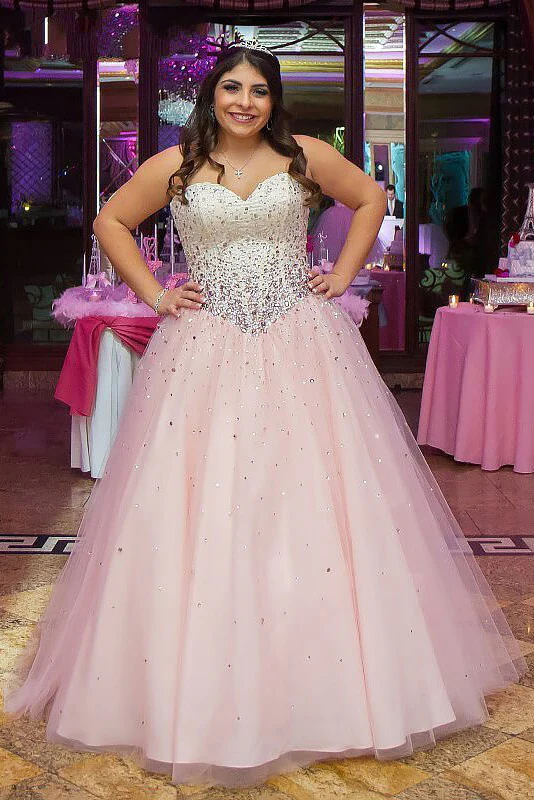Princess Pink Sweetheart Strapless Tulle Ball Gown Beading Long Plus Size Prom Dresses OK663