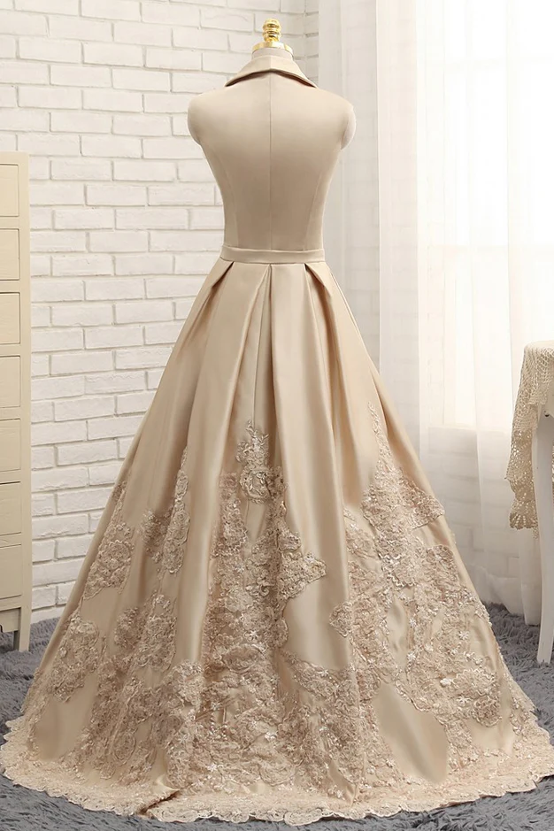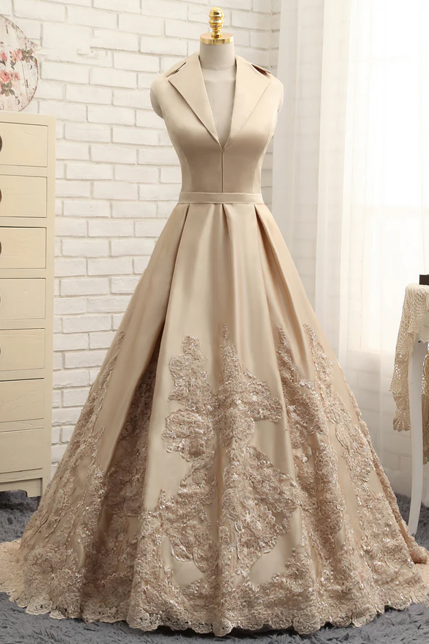 A-line V-neck Cap Sleeves Satin Appliques Lace Prom Gowns Long Formal Evening Dresses OK643