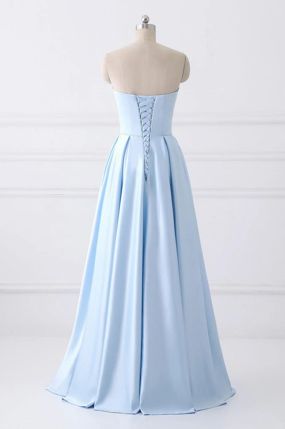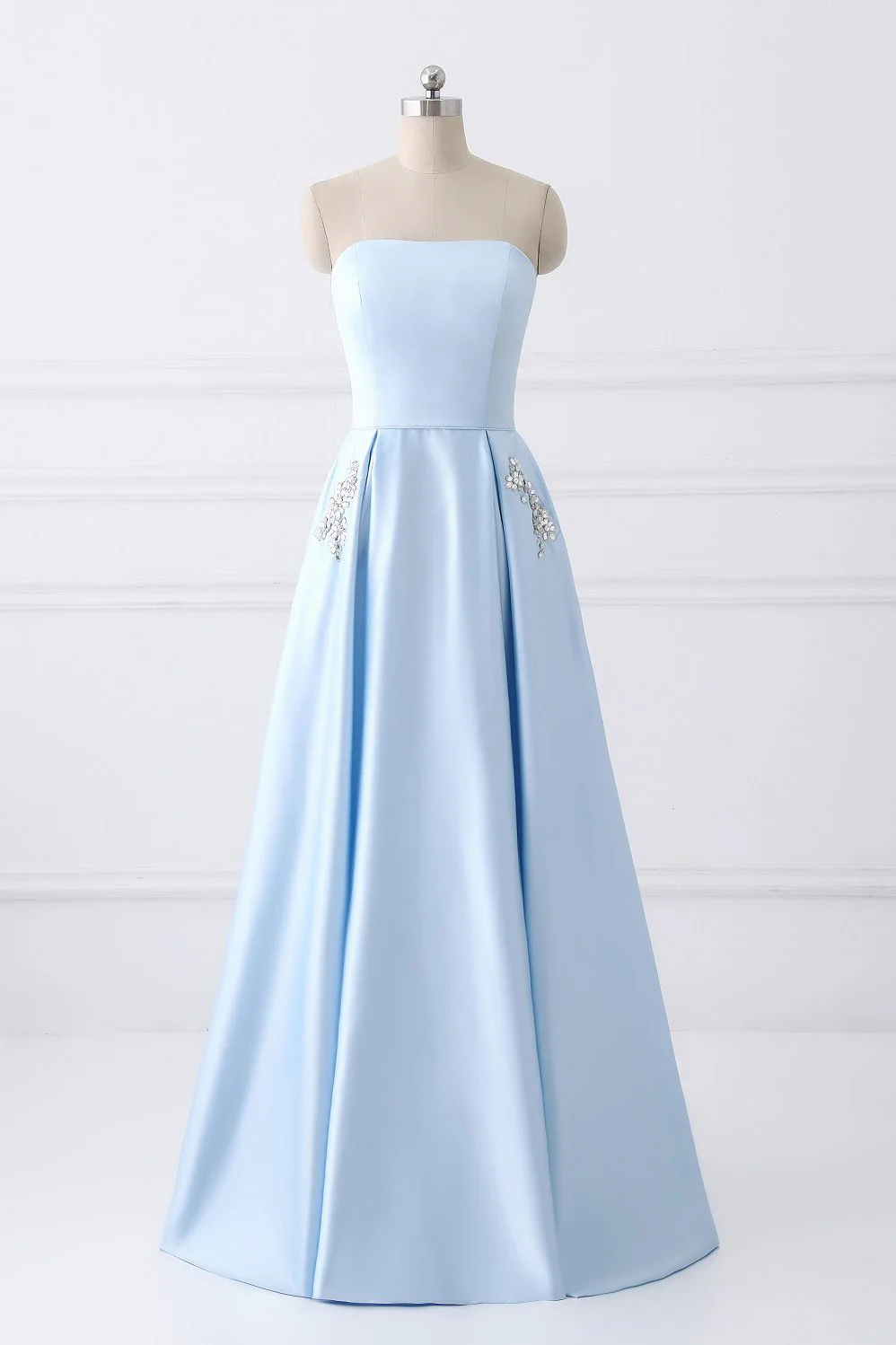 Simple A-line Strapless Long Crystal Light Blue Cheap Prom Dress with Pocket OK669