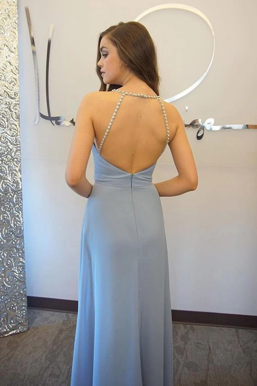 Sexy Blue Open Back Chiffon Long Prom Dresses,Simple Sleeveless Evening Dress OK684