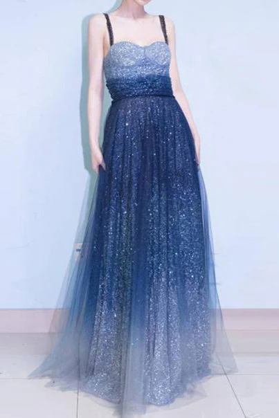 A-line Spaghetti Strap Sleeveless Royal Blue Tulle Sequins Modest Long Prom Dresses OK616