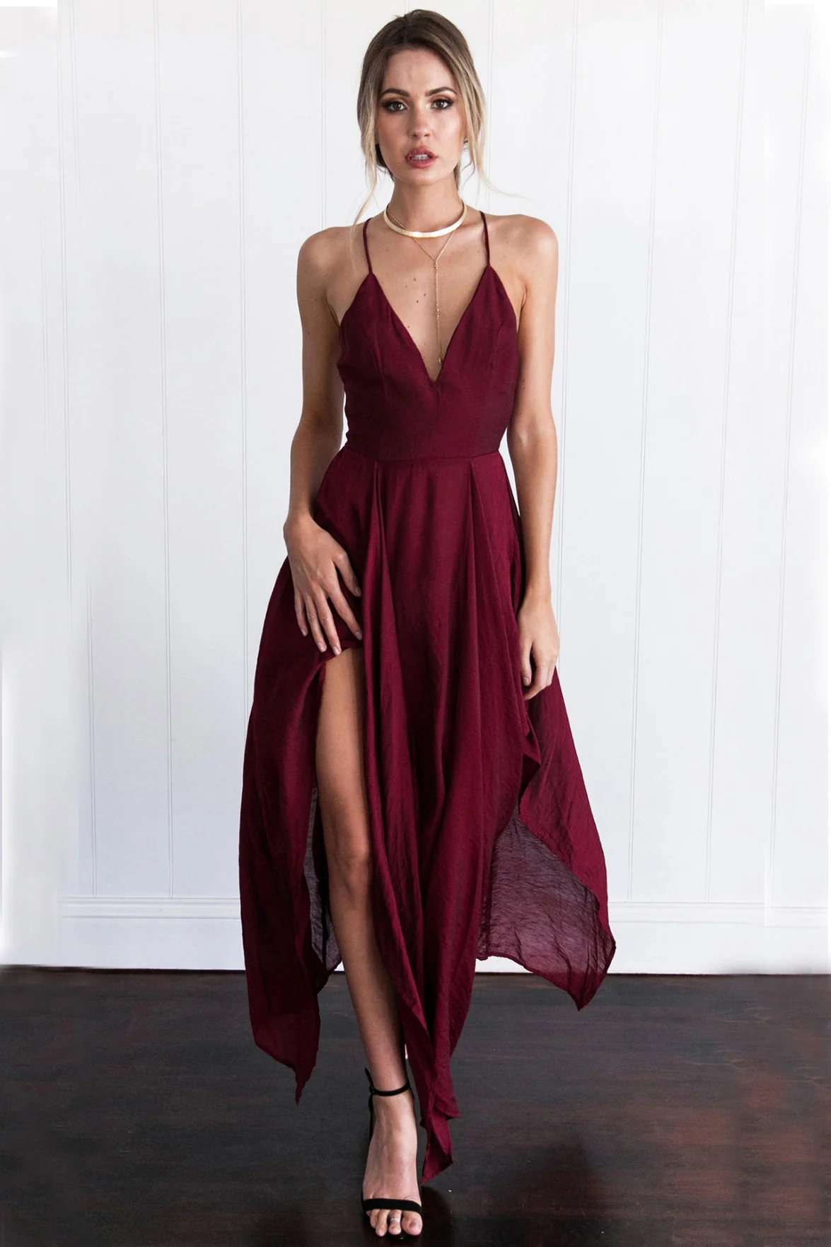 Chiffon Spaghetti Straps V Neck Cross Back Burgundy Assymetrical Hem Long Prom Evening Dress OK629