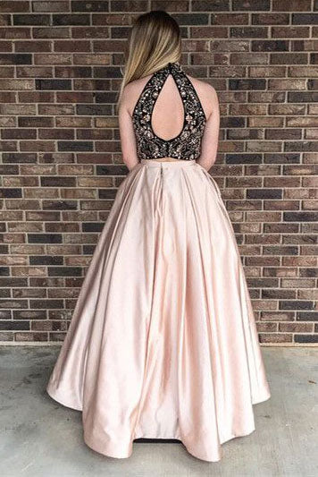 High Neck Blush A Line Black Lace Sleeveless Prom Dresses With Pockets OK687